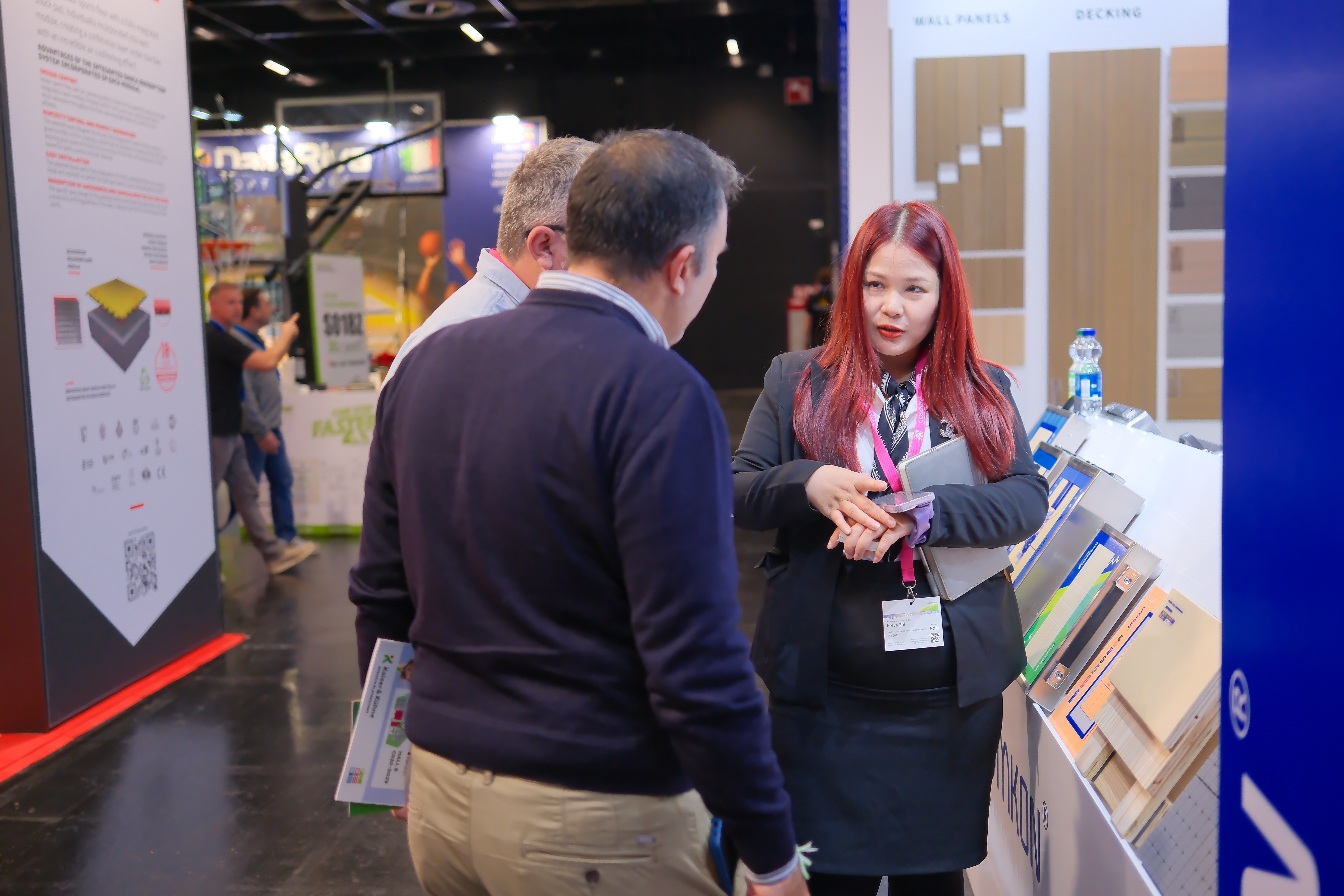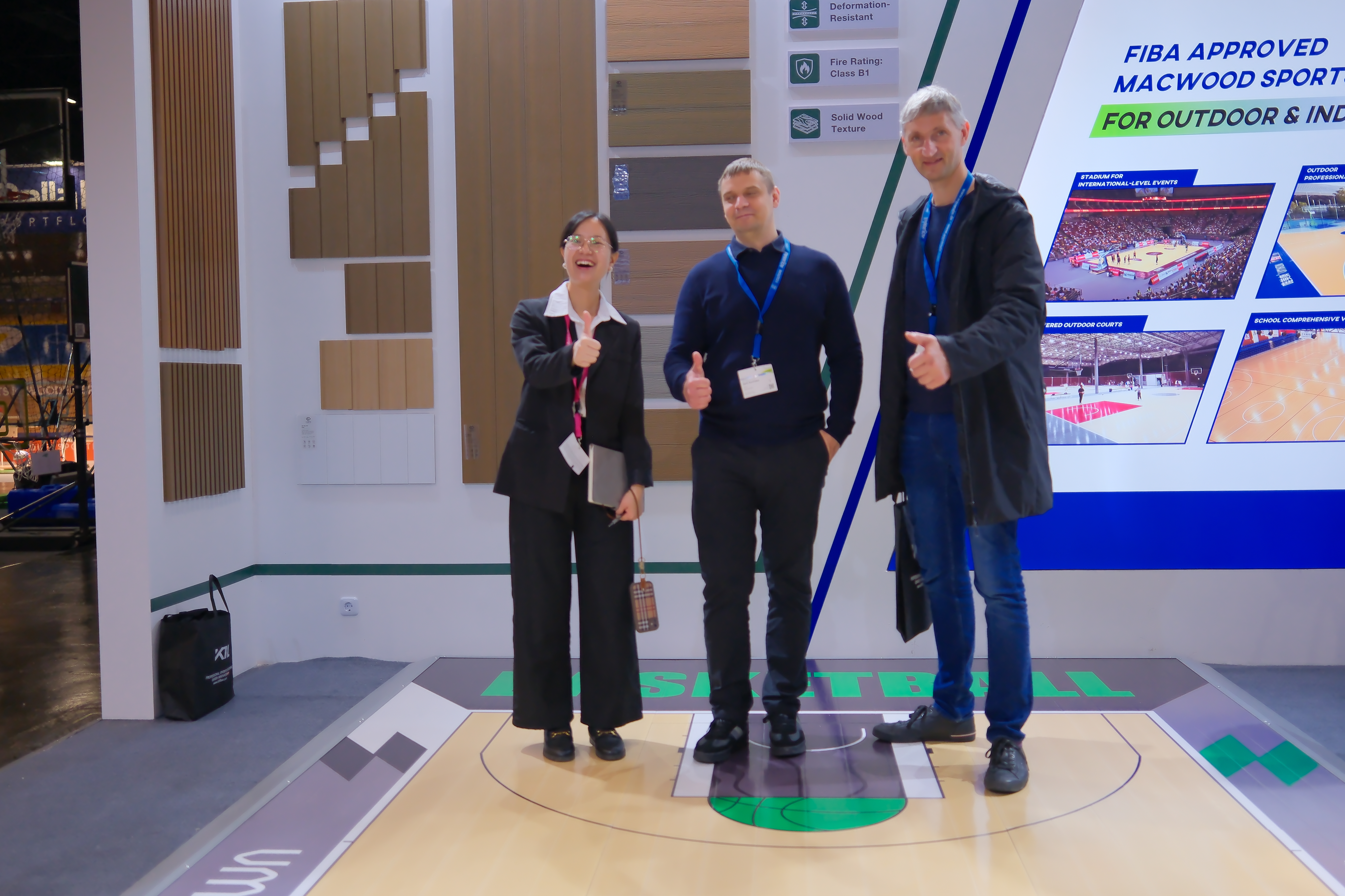 展會現(xiàn)場,唯美康通過“模擬戶外球場噴淋系統(tǒng)”的實景演示,讓觀眾直觀看到生物基地板在潮濕環(huán)境下的穩(wěn)定表現(xiàn),吸引大量專業(yè)觀眾駐足交流。來自歐洲多國的設計師、采購與技術人員就戶外適用性、維護便利性、材料可持續(xù)等議題進行了深入探討。